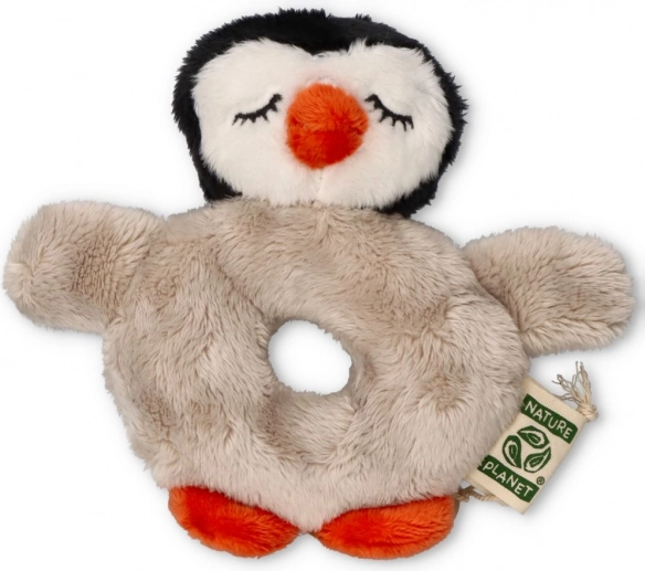 Plyšová hrkálka NATURE PLANET Tučniak: mäkká, ľahko uchopiteľná, s recyklovanou výplňou a jemným zvukom. Podporuje motoriku a zmyslový rozvoj. CE.