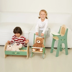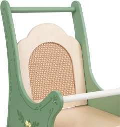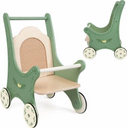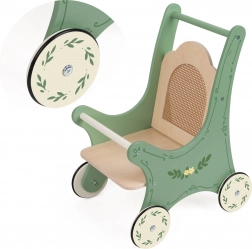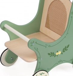 Tento očarujúci kočík pre bábiky kombinuje klasický štýl s prírodnými materiálmi. Jeho zelená konštrukcia s kvetinovými ornamentmi a ratanovou opierkou priťahuje pozornosť a vytvára jedinečný retro štýl. Perfektné pre malé deti, ktoré sa rady hrajú na opatrovateľov.