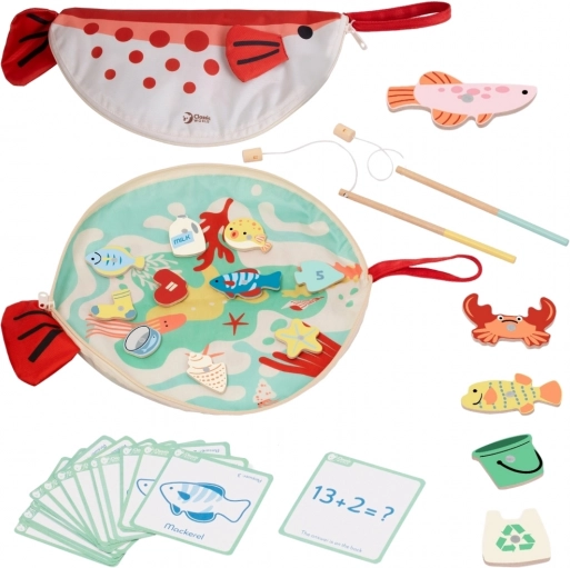 - 2 magnetické prúty, drevené rybky a predmety na chytanie, edukačné karty, podložka v tvare ryby / puzdro