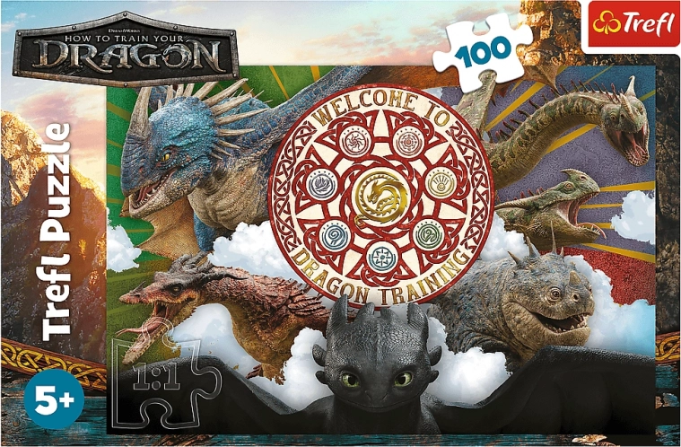 Detské puzzle od značky Trefl s motívom z filmu Ako vycvičiť draka ponúknu 100 dielikov a po zložení vytvoria obrázok s rozmerom 410 × 275 mm. Vyrobené z kvalitných a ekologických materiálov, špeciálny kalandrovaný papier obmedzuje odlesky a uľahčuje skladanie.