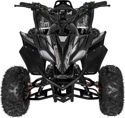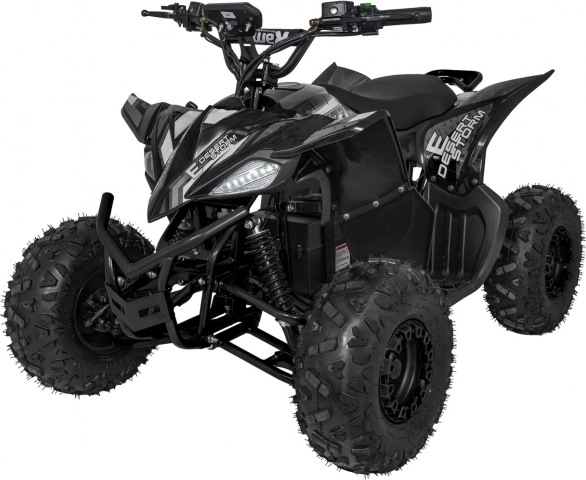 Robustný elektrický terénny štvorkolový ATV DESERT STORM LIFT v elegantnej čiernej farbe ponúka výkonný bezkefkový motor 800 W (48 V), batériu 48 V / 20 Ah, hydraulické kotúčové brzdy a nastaviteľné odpruženie. Vďaka rýchlosti až 40 km/h, veľkým off-road pneumatikám 16x8.0-7 a odolnému rámu je ideálny na rekreačnú jazdu v teréne.
