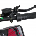 Bezpečnosť podporujú hydraulické kotúčové brzdy na oboch nápravách a LED osvetlenie s prepínačom a zadným brzdovým svetlom. Nastaviteľné hydraulické tlmiče vpredu (2x) aj vzadu zvyšujú komfort. Mäkké, vodoodolné sedlo (61×29 cm) a vysoký podvozok so svetlou výškou 19 cm uľahčujú jazdu po nerovnostiach.
