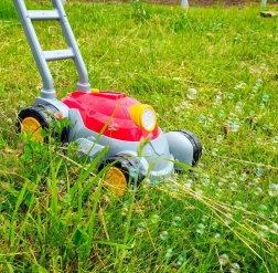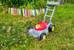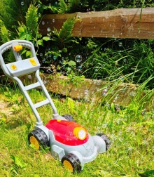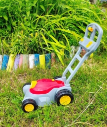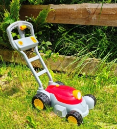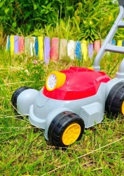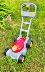 Pevná plastová rukoväť a veľké kolesá uľahčujú tlačenie po záhrade. Ľahká konštrukcia je ideálna pre malé ruky.