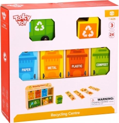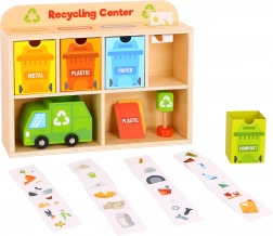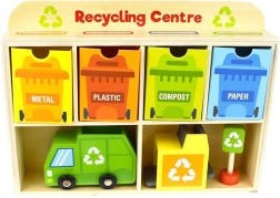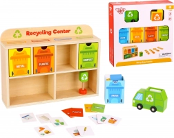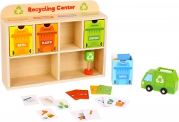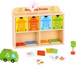 S Centrom Recyklácie od Tooky Toy sa deti naučia, ako správne triediť odpad. Každá karta zobrazuje odpad z rôznych materiálov, ktorý deti vložia do smetiarskeho vozu, potom do triediča a nakoniec do správneho kontajnera umiestneného v drevenej skrinke.