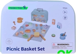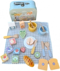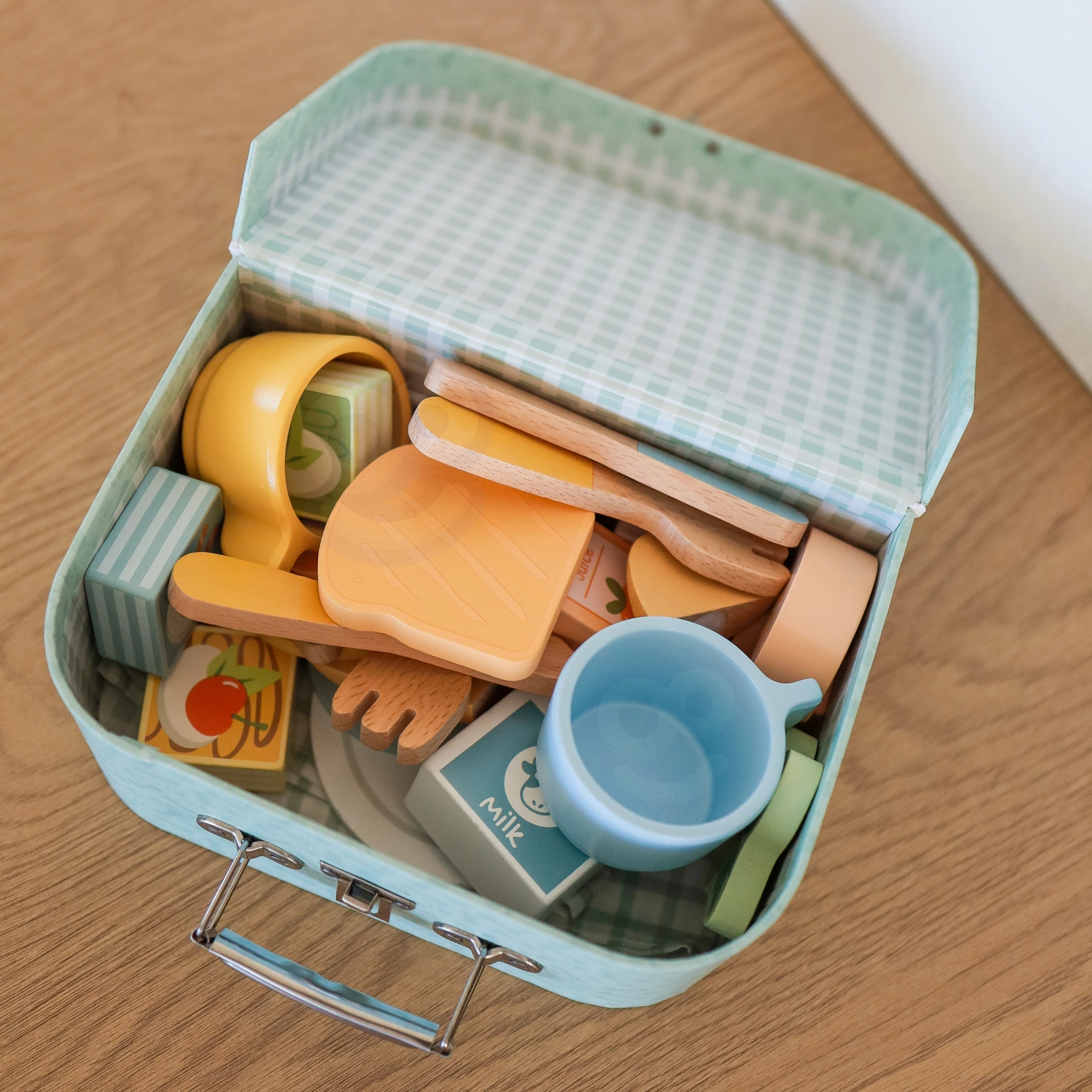 Drevený piknikový set TOOKY TOY v roztomilom tyrkysovom kufríku prináša deťom realistickú zábavu pri príprave a servírovaní jedla. Farebné ovocie a pečivo možno „krájať“ a znovu spájať, nechýbajú tanieriky, príbory, hrnčeky ani kartóniky s mliekom a džúsom. Hra rozvíja jemnú motoriku, koordináciu ruka–oko aj jazykové zručnosti počas prirodzeného hrania rolí.