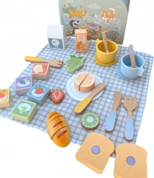 Realistické drevené potraviny a riad podnecujú fantáziu. Deti môžu pripraviť raňajky, „nakrájať“ ovocie a servírovať hosťom ako v skutočnej kuchyni.