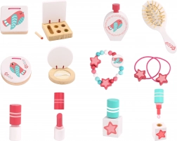 - Súčasťou sady sú drevené doplnky: lak na nechty, rúž, náramok, náušnice, kefa na vlasy, parfum, púdrenka a očné tiene.
