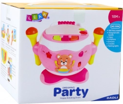 Hudobný bubon je navrhnutý tak, aby spájal funkcie bubna, vzdelávacej hračky a karaoke sady. Ponúka 8 rôznych interaktívnych režimov, ktoré zahŕňajú zvuky zvierat, piesne, kvízy, rytmické melódie a príbehy. Farebný dotykový panel sa rozsvieti podľa rytmu zvukov, čo dodáva hre na bubon extra kúzlo.