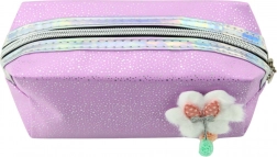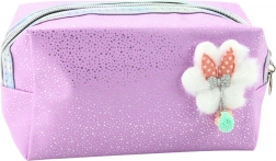 Štýlová kozmetická taštička je jedinečný doplnok do školskej výbavy alebo na každodenné používanie. Vyrobená v efektnom fialovom odtieni, ozdobená jemnými, trblietavými drobkami, priťahuje pozornosť svojím neprehliadnuteľným dizajnom. Na prednej strane taštičky sa nachádza roztomilá aplikácia v tvare nadýchaného obláčika s mašľou, ku ktorej sú pripojené dve dekoratívne guličky, ktoré dodávajú celku jedinečný pôvab.