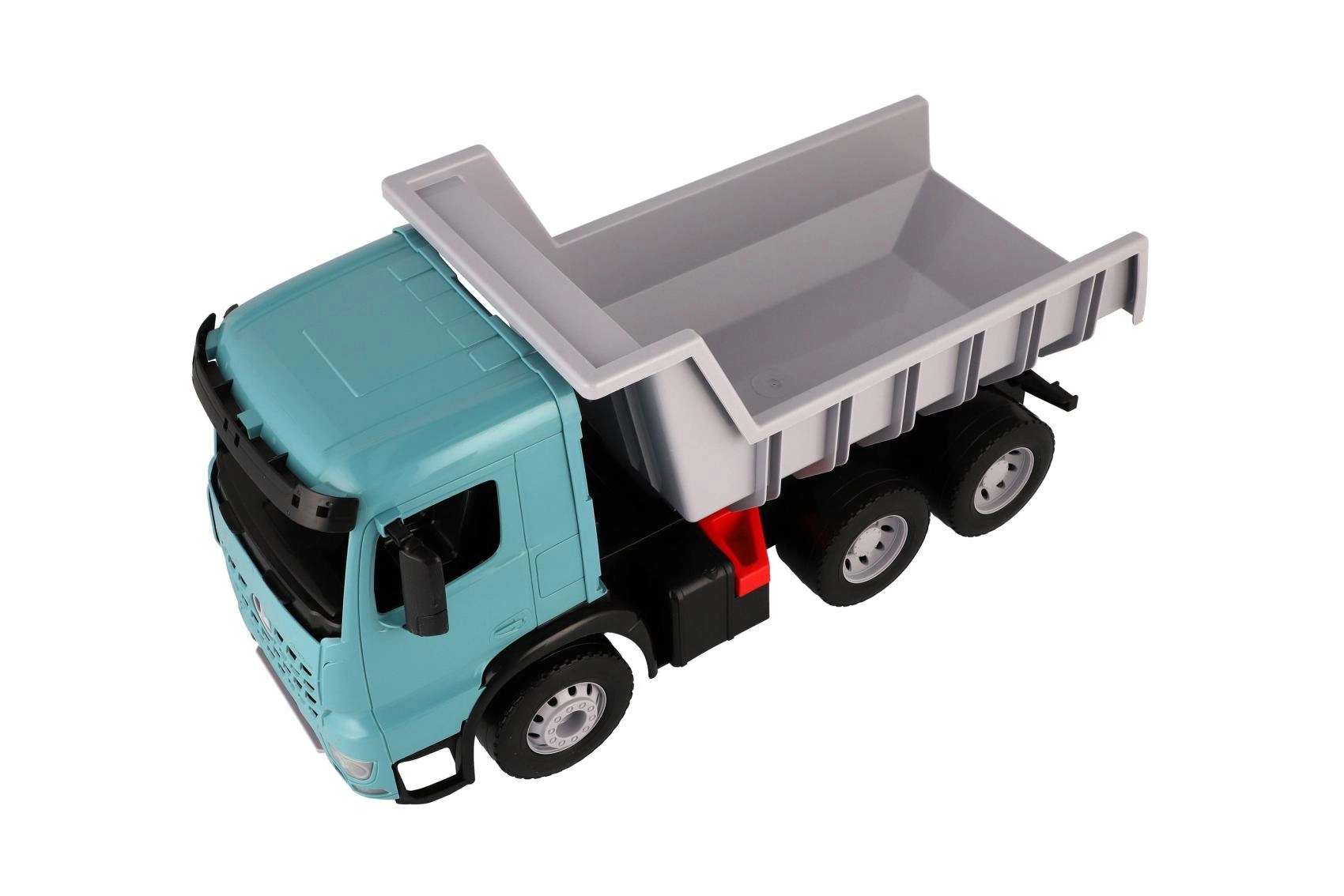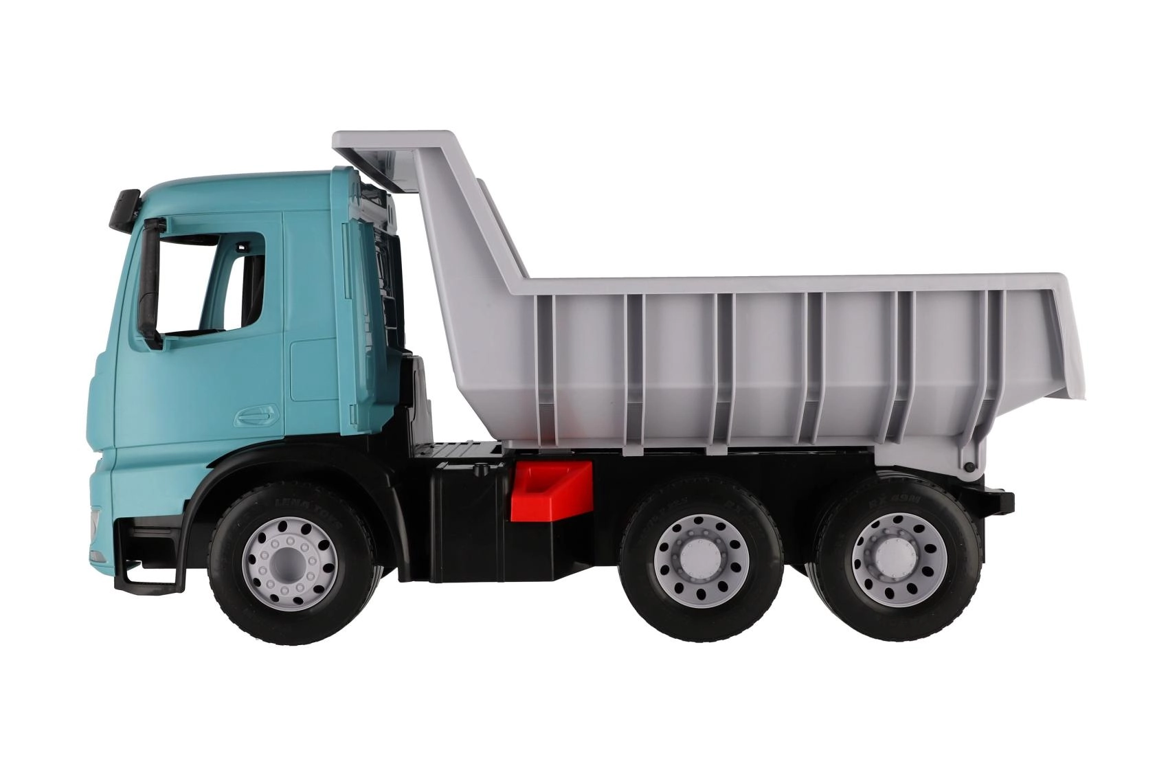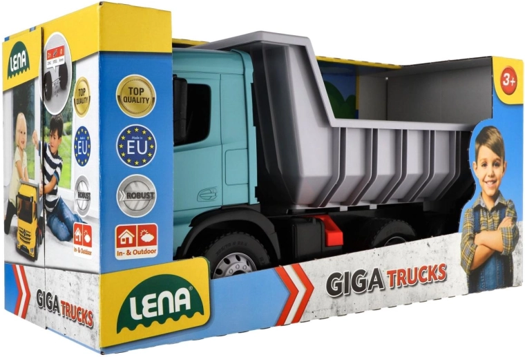 Veľký plastový sklápač pre deti od 3 rokov s realistickým vzhľadom vozidla MERCEDES-BENZ AROCS. Ponúka priestrannú korbu s praktickou poistkou proti samovoľnému vyklopeniu, odolnú konštrukciu z kvalitného plastu a moderné tyrkysovo-sivé prevedenie. Ideálne na hranie doma aj vonku, na prevoz piesku, hračiek aj fantázie.