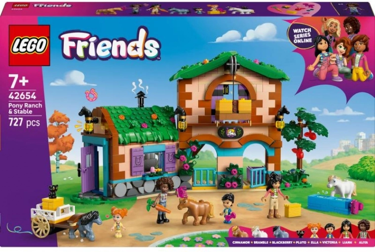 Súčasťou sú obľúbené postavy Aliya a Liann (minifigúrky) a Victoria s Ellou (mikrofigúrky), ďalej mačka a traja rozkošní poníci. Bohatá sada doplnkov – od stúh a kefiek cez rúru, sušienky a černice až po mrkvu – podporuje nápadité príbehy, starostlivosť a kŕmenie koníkov. Aplikácia LEGO Builder umožní modely približovať, otáčať a sledovať postup stavby.