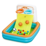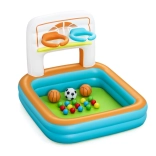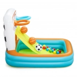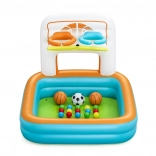 Nafukovacie hracie centrum Bestway Kick 'N Swish™ je ideálnou voľbou pre aktívnu zábavu vašich detí. Tento multifunkčný bazén kombinuje basketbalové koše s návratovou rampou, ktorá zabezpečuje hladký priebeh hry, a minibránku pre tréning striel na cieľ. Pripojte 15 farebných lôpt a premeňte bazén na farebný herný raj, kde si deti môžu hrať a relaxovať.