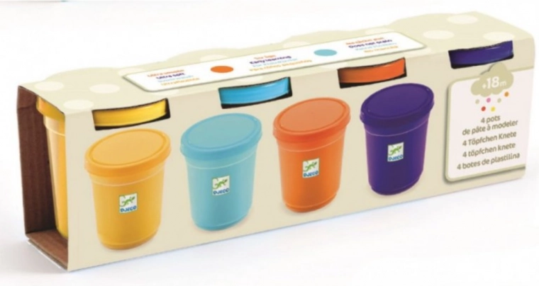 Užite si zábavu s modelínou DJECO, ktorá obsahuje 4 prírodné farby ideálne pre rozvoj kreativity a motoriky vašich detí.
