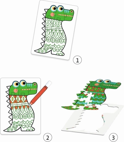 Kreatívna sada pre malých umelcov a milovníkov skladania: najprv si puzzle sami vyfarbia, potom ich poskladajú podľa obrysov. 4 obrázky zvieratiek po 12 dielikoch, zábava rozvíjajúca kreativitu, jemnú motoriku a logiku. Eko balenie šetrné k prírode. Návod je súčasťou, kresliace potreby nie sú priložené.