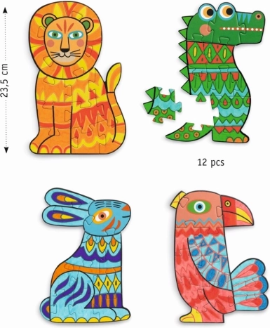 Djeco vyfarbovacie obrysové puzzle Zvieratká: 4×12 dielikov, vyfarbi a poskladaj. Rozvíja kreativitu a jemnú motoriku. Eko balenie, návod vo vnútri, rozmer 15×24 cm.