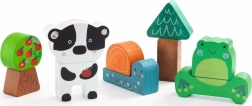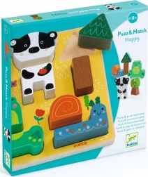 Drevená sada Djeco Puzz & Match Happy Zvieratká ponúka zábavné skladanie aj stavanie v jednom. Vďaka širokým dielikom sa puzzle deťom ľahko držia a manipulácia je prirodzená a bezpečná. Niektoré prvky možno postaviť nastojato, čo rozširuje hru o fantastické scénky a podporuje kreativitu.