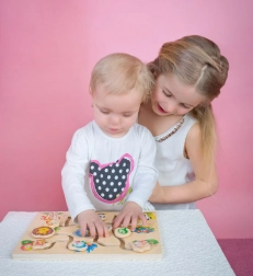 Presúvanie dielikov po dráhach a správne priradenie hláv k telám zvierat posilňuje koordináciu oko–ruka, trpezlivosť a sústredenie detí.