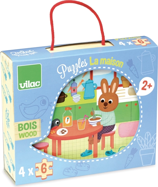 Objavte kvalitné drevené puzzle VILAC s motívmi domácnosti, ideálne pre najmenších od 2 rokov. Balenie obsahuje 4 samostatné puzzle po 6 dielikoch v praktickom drevenom boxe s bavlnenou rúčkou. Skvelá voľba na rozvoj jemnej motoriky, logiky a sústredenia detí.