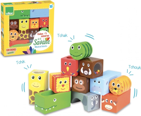 Objavte svet zvukov a fantázie s drevenými kockami VILAC Savana. Sada obsahuje 11 senzorických kociek, ktoré deťom pomáhajú rozvíjať jemnú motoriku, sluchové vnímanie a koordináciu oko-ruka. Atraktívny motív savany a rôzne zvukové efekty zaručia dlhé hodiny zábavy.