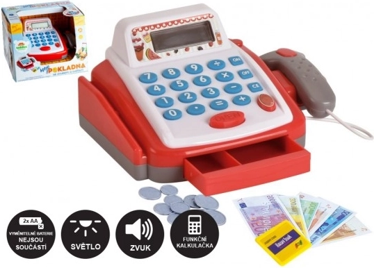 Kalkulačka s displejom, otváracia zásuvka na peniaze, čítačka čiarových kódov so svetlom a zvukom