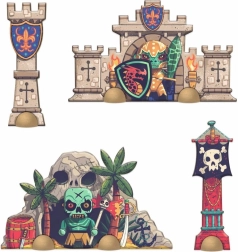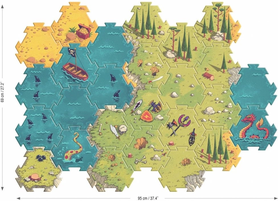 Tento originálny set kombinuje radosť z puzzle s tvorivou hrou. 26 veľkých šesťuholníkových dielov umožňuje zostaviť rozľahlú scénu, zatiaľ čo 4 vertikálne kulisy na drevených podstavcoch dodajú celej bitke priestorový efekt. Diely sú vyrobené z veľmi pevného kartónu s certifikáciou FSC®, takže vydržia aj časté hranie.