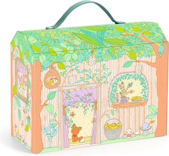 Skladací kufrík s ilustráciami lesa sa po otvorení premení na viacposchodovú scénu s poličkami, stolíkom a rozkladacím dvorčekom.