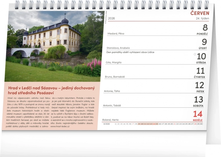 Vyberte sa na výlet po čarovných hradoch a zámkoch Čiech, Moravy a Slezska s naším stolovým kalendárom s farebnými fotografiami P. Hrona. Súčasťou kalendára je tiež české týždenné kalendárium s priestorom pre vaše poznámky.