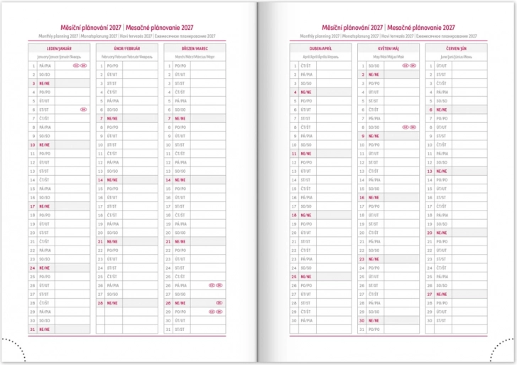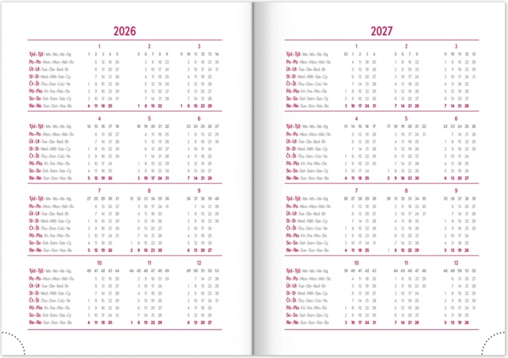 Tento exkluzívny diár ponúka pestrú škálu jazykov vrátane češtiny, slovenčiny, angličtiny, nemčiny, maďarčiny a ruštiny, čo umožňuje jeho využitie pre široké spektrum používateľov. Aprint 2026 zahŕňa: