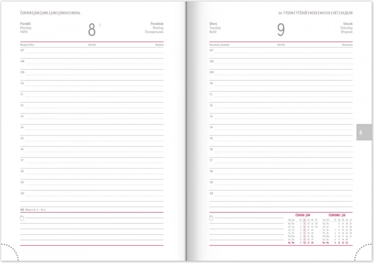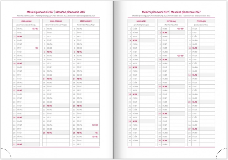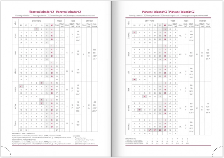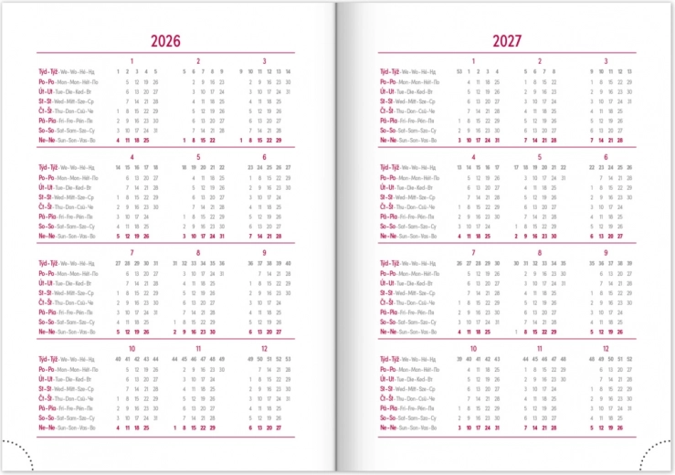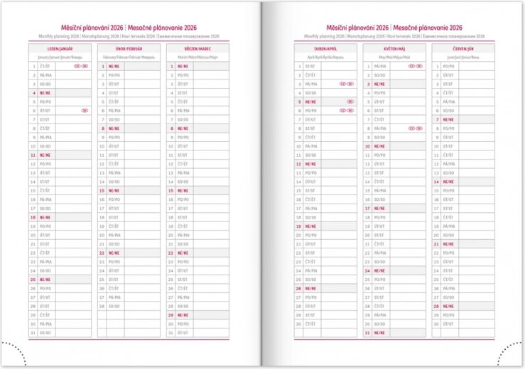 Denný diár 2026 v elegantnej červenej farbe ponúka praktickosť a štýl. Obsahuje česko-slovenské kalendárium s rozšírenými jazykovými verziami a novou razbou letopočtu.