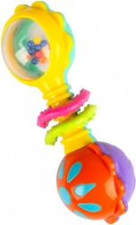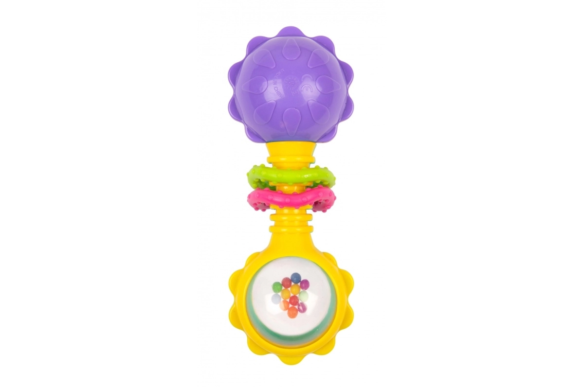 Playgro Detské hryzadlo činka je hravá a farebná hračka, ktorá deťom umožňuje ľahké uchopenie vďaka ergonomickému dizajnu. Činka vydáva pri otáčaní klik-klak zvuky a pri zatrasení chrasťavý zvuk, čím podporuje sluchovú stimuláciu a rozvoj motorických schopností.