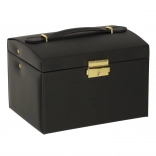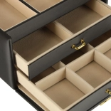 Dômyselné členenie zahŕňa valčeky na prstene, priehradky na drobnosti a 2 výsuvné zásuvky s delením na retiazky, náramky aj náušnice. Zamkýnanie na kľúčik a spoľahlivé západkové uzatváranie zaisťujú bezpečné uloženie cenností.