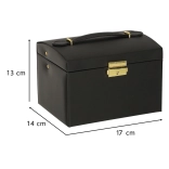 Elegantná čierna šperkovnica so zrkadielkom a zásuvkami na prehľadné ukladanie prsteňov, náušníc, náramkov a náhrdelníkov. Ponúka priestranné priehradky, dve zásuvky, mäkkú podšívku proti poškodeniu a zamkýnanie na kľúčik pre vyššiu bezpečnosť. Ideálne riešenie na organizované ukladanie bižutérie doma aj na cesty.