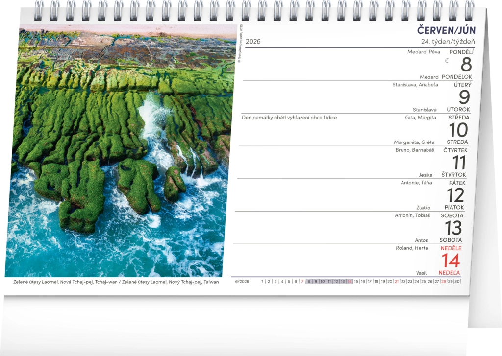 Kalendár má rozmery 23,1 x 14,5 cm, čo je ideálna veľkosť pre váš pracovný stôl.