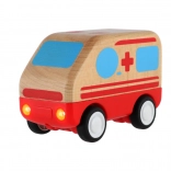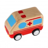 Štýlová drevená sanitka na zotrvačník, ktorá ponúka skvelú zábavu na kolieskach pre najmenších. Stačí jemne postrčiť a sanitka sa vydá rýchlo na pomoc, čo deti nesmierne baví.