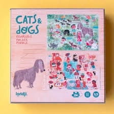 Puzzle Mačky a Psi od značky Londji ponúka nádherne ilustrované zobrazenie zvieracích priateľov a ich majiteľov v rôznych zábavných situáciách. Toto obojstranné puzzle obsahuje 24 dielikov, ktoré sa dajú ľahko skladať a poskytne deťom hodiny zábavy.