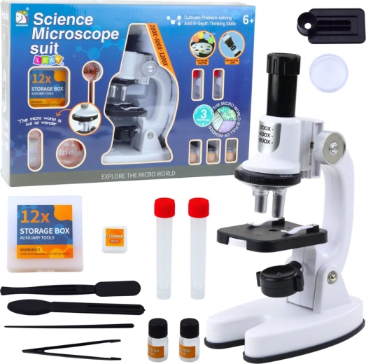 Súčasťou súpravy je rada nevyhnutných nástrojov – pipeta, pinzeta, vzorky, fľaštičky, kontajnery a podložné sklíčka, ktoré umožňujú vykonávať rôzne zaujímavé pokusy a pozorovania. Všetko je zabalené v pevnom obale, čo robí z mikroskopu ideálny darček.