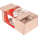 Stavebnica je vyrobená z odolného dreva s hladkým povrchom pre bezpečné hranie. Praktický drevený box so zasúvacím vekom uľahčuje ukladanie a poriadok v detskej izbe.