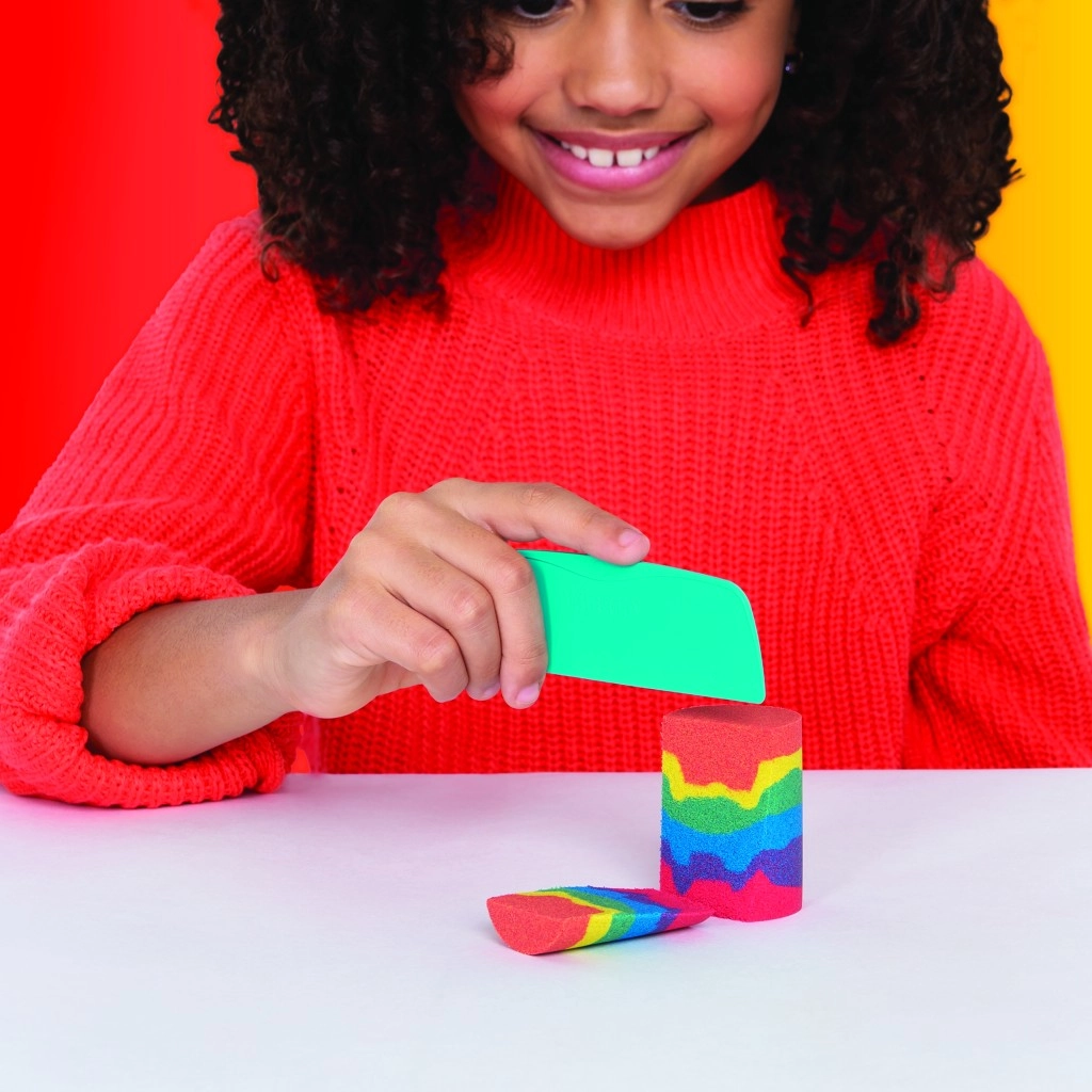 Táto sada kombinuje ikonický piesok Kinetic Sand s praktickými nástrojmi na rezanie, miešanie a formovanie. Vytvárajte realistické dúhy, vrstvite farby a stavajte pestré hrady – piesok drží tvar, nelepí sa a je príjemný na dotyk.