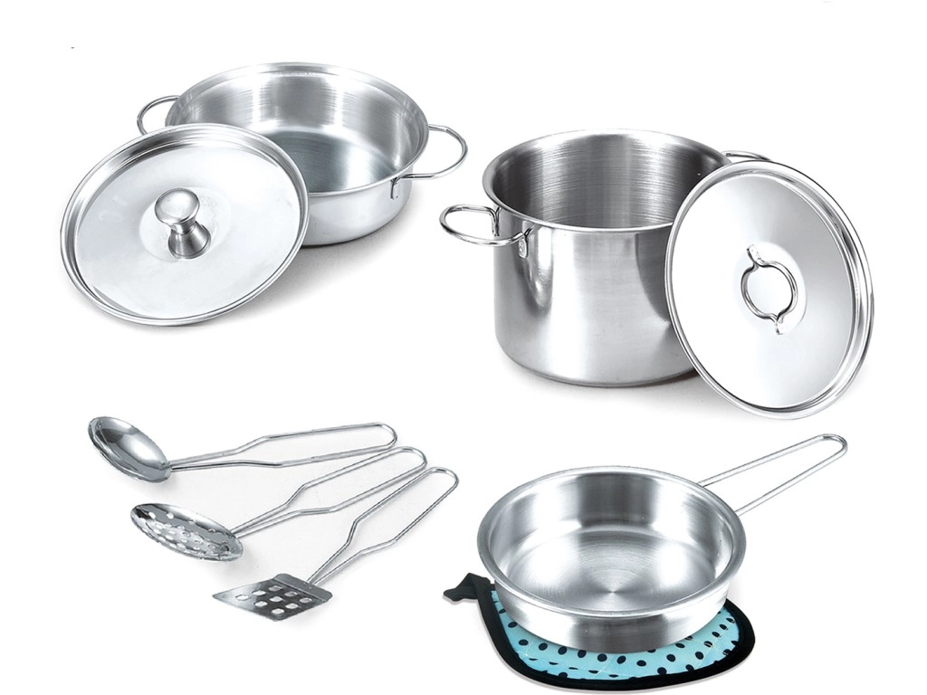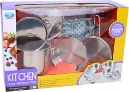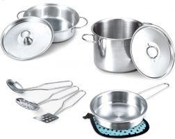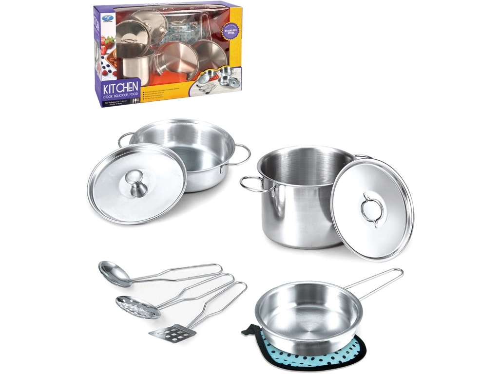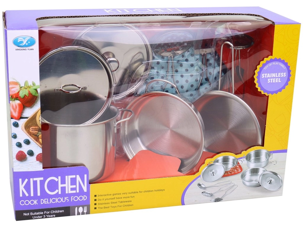 Táto sada nerezových riadov obsahuje deväť kusov, ktoré rozšíria možnosti detských hier v kuchyni. Ukážte svojim deťom, ako sa varí s touto skvelou sadou. Riad je vyrobený z plechu, čo ho robí bezpečným a odolným pre detské hry. Darčekové balenie typu window box zabezpečí, že sada bude skvelo vyzerať už na prvý pohľad.