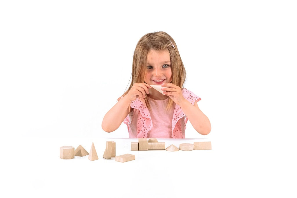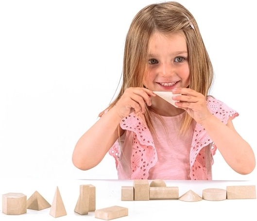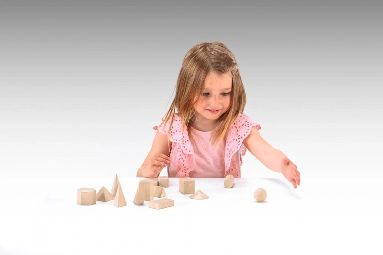 Táto drevená sada obsahuje 14 rôznych geometrických telies, ktoré slúžia ako ideálny nástroj pre skoré učenie geometrie. Deti sa naučia rozpoznávať tvary ako kocka, kváder, hranol, valec, ihlan, kužeľ a guľa.