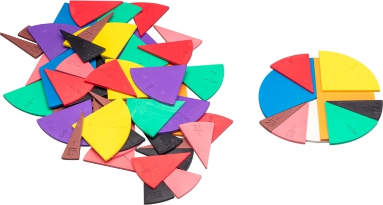 Táto sada s 71 dielmi je ideálna pre učiteľské účely a pomáha deťom pochopiť základy operácií so zlomkami. Každý dielok je označený príslušným zlomkom:
