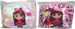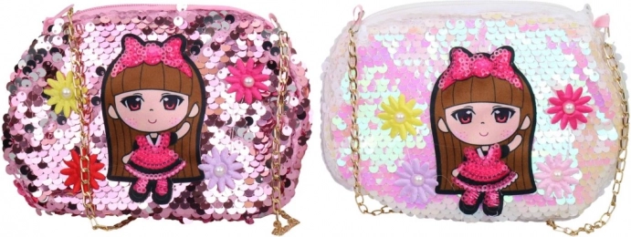 Kozmetická kabelka zdobená flitrami a roztomilým dizajnom kreslenej holčičky prináša radosť a zábavu do sveta módy.