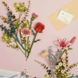 Balenie obsahuje všetky potrebné dieliky: drevený košík, ružovú ľaliu, červenú ružu, harmanček, ružový karafiát, eukalyptus a dekoratívne rastliny. Táto sada je dodávaná v neskladanom stave s podrobným návodom na zostavenie.