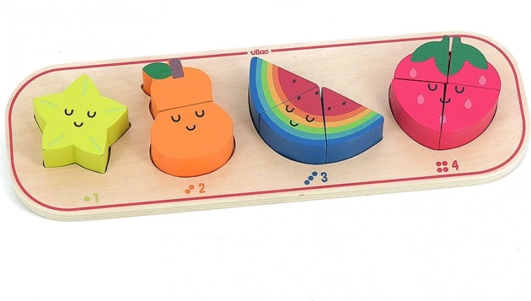 Toto zábavné a edukatívne puzzle prináša deťom radosť z objavovania a učenia sa prostredníctvom hry. Každý dielik ovocia, ako je žltá karambola, oranžová hruška, farebný melón a červená jahoda, prichádza v rôznom počte dielikov na vkladanie do drevenej podložky. Deti sa učia rozpoznávať tvary, farby a zodpovedajúce čísla, čo prirodzene rozvíja ich jemnú motoriku a koordináciu ruka-oko.