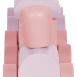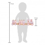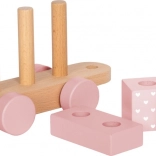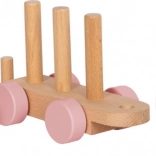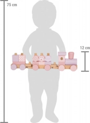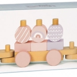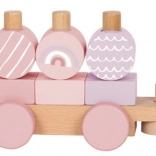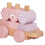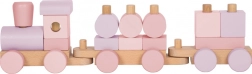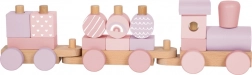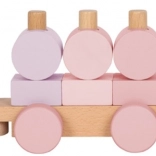 Tento drevený vláčik obsahuje lokomotívu s dvoma vagónikmi a 14 farebne zladenými stavebnými dielikmi, ktoré podporujú skladanie a voľnú hru. Kocky sa nasadzujú na drevené tyčky, čo rozvíja jemnú motoriku a koordináciu pohybov. Jednotlivé dieliky sa dajú používať tiež samostatne ako drevené kocky, ideálne pre rozvoj fantázie malých staviteľov.