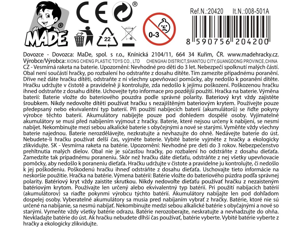 Vesmírna raketa pre malých objaviteľov je perfektnou hračkou, ktorá obsahuje všetko potrebné pre skvelú zábavu. Ideálna voľba pre všetkých malých chlapcov, ktorí sa chcú cítiť ako skutoční astronauti!