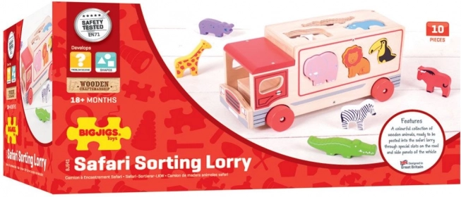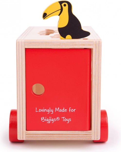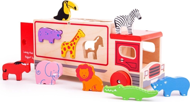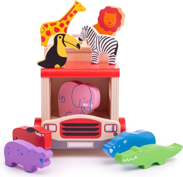 Táto pestrofarebná drevená hračka obsahuje rozpoznateľné zvieratká, ktoré možno naložiť na nákladné auto pomocou špeciálnych otvorov na streche a bokoch vozidla. Deti môžu triediť tvary a učiť sa o rôznych zvieratách, potom každé zviera vložiť do správneho otvoru. Keď sú všetky zvieratká na svojom mieste, zadné dvere nákladného auta sa zatvoria a môžu sa vydať na ďalšiu dobrodružnú cestu.