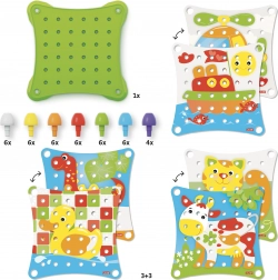Súčasťou balenia je plastová základňa, tri obojstranne ilustrované karty a spolu 40 farebných kolíčkov. Deti môžu skladať podľa predlôh alebo vytvárať vlastné obrázky – zábava, ktorá rastie spolu s nimi.