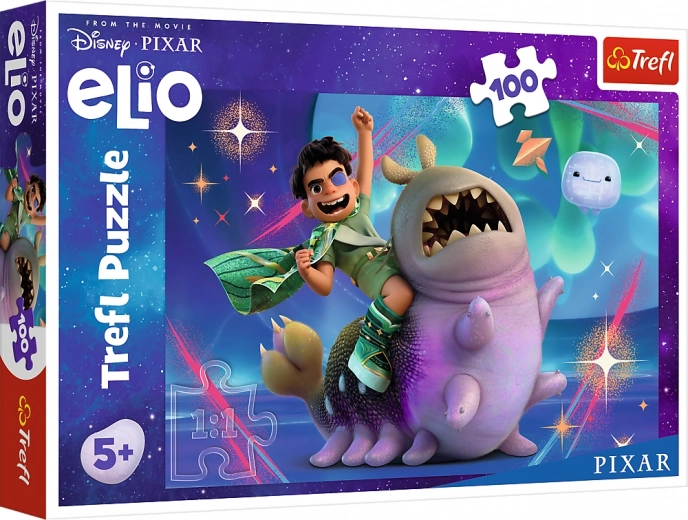 Puzzle Elio a vesmírne dobrodružstvá so 100 dielikov, rozmery 41 x 27,5 cm, ideálne pre rodinnú zábavu.