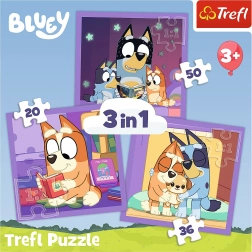 Objavte čaro skladania s puzzle TREFL Zoznámenie sa s Bluey 3v1. Toto puzzle ponúka: